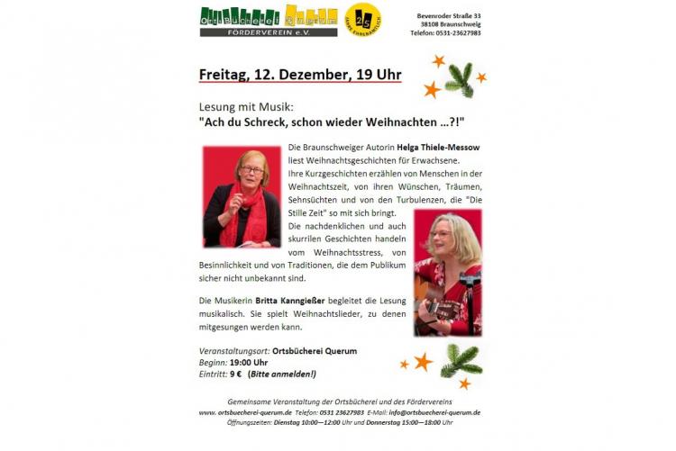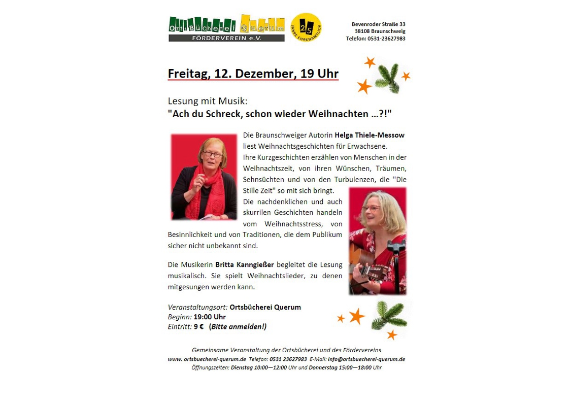 Die Braunschweiger Autorin Helga Thiele-Messow liest Weihnachtsgeschichten für Erwachsene. Ihre Kurzgeschichten erzählen von Menschen in der Weihnachtszeit, von ihren Wünschen, Träumen, Sehnsüchten und von den Turbulenzen, die "Die Stille Zeit" so mit sich bringt. Die skurrilen und nachdenklichen Geschichten handeln vom Weihnachtsstress, von Besinnlichkeit und von Traditionen, die dem Publikum sicher nicht unbekannt sind.