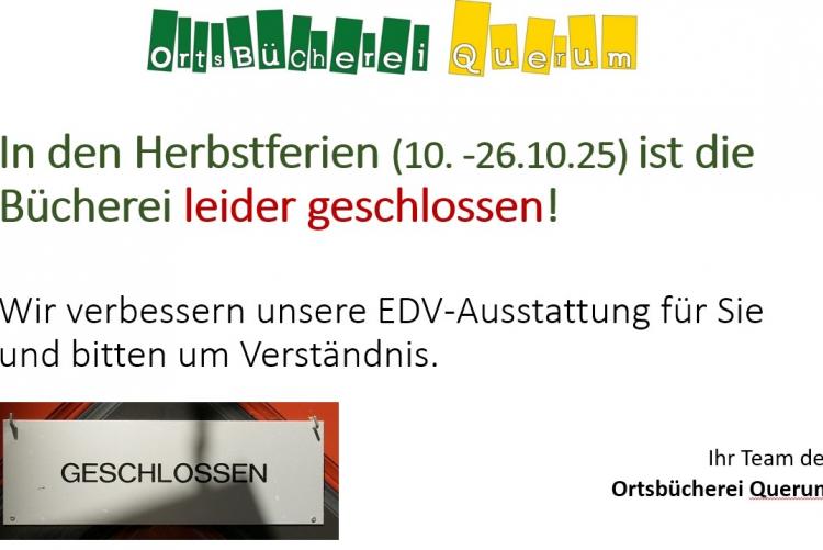 In den Herbstferien ( 10. - 26.10.25) ist die Bücherei leider geschlossen! Wir verbessern unsere EDV-Ausstattung für Sie und bitten um Verständnis.