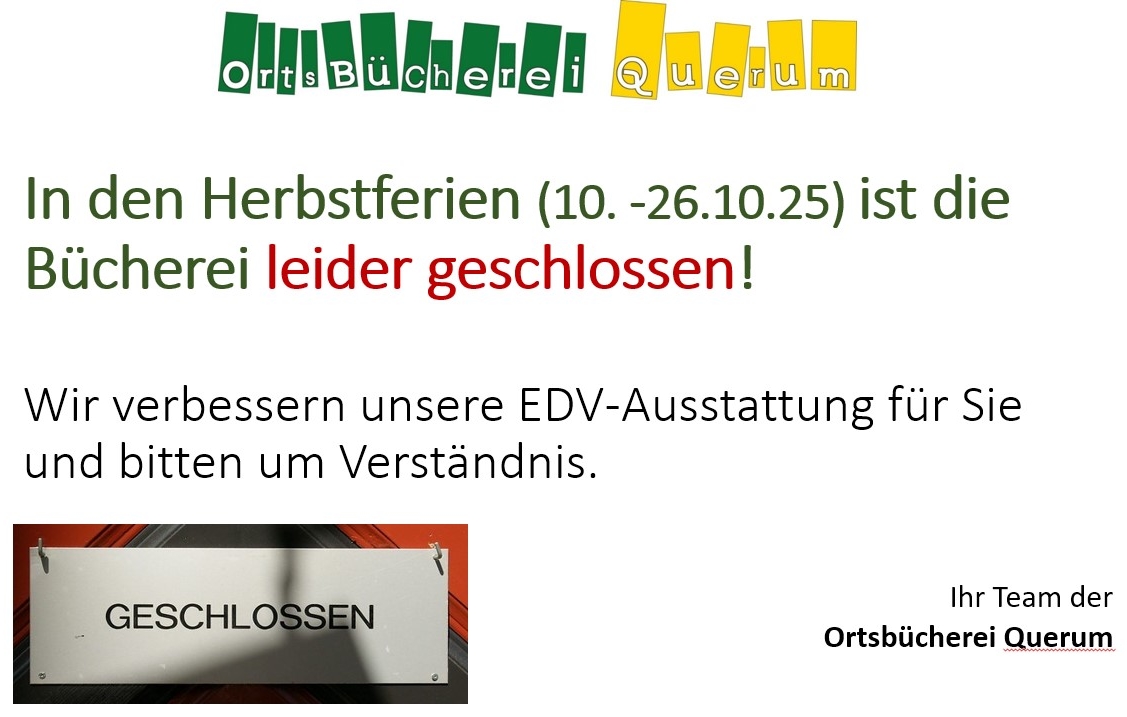 In den Herbstferien ( 10. - 26.10.25) ist die Bücherei leider geschlossen! Wir verbessern unsere EDV-Ausstattung für Sie und bitten um Verständnis.